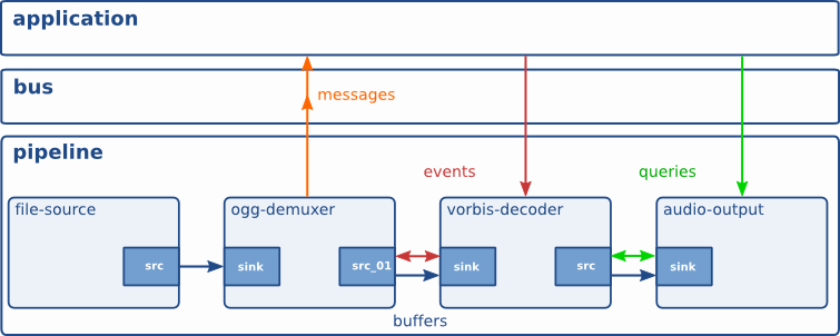 管道是一个顶级容器。 它为应用程序提供总线并管理其子级的同步。 当您将其设置为“暂停”或“播放”状态时,数据流将开始并进行媒体处理。 一旦启动,管道将在单独的线程中运行,直到您停止它们或到达数据流的末尾。